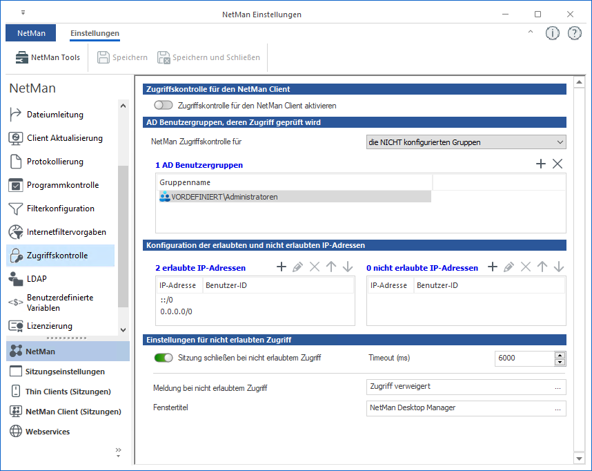 Zugriffskontrolle für den NetMan Client aktivieren aktiviert die Zugriffskontrolle.