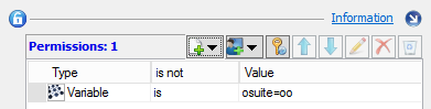 5. On the Permissions page, define the condition under which the toolbox will be opened for the user. In our example, the "osuite" variable has to contain the value "ms," because the toolbox shows the Program Scripts created for serving the Microsoft programs. Click on the New condition button and the top of the list and select Variable.