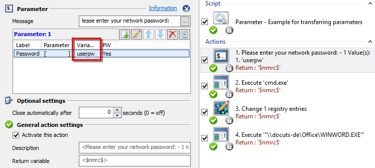 An example for use of the Parameter action might be a case in which you wish to use the "NET USE" command to connect a network drive and make it available as user drive for the subsequent Program action. Rather than entering the login credentials in a Connect Drive action, a Parameter is configured to prompt user input of a password. A Password action is not particularly well-suited for use here, as it serves to determine whether or not the user has the rights required for the subsequent actions (e.g. to open a certain folder in the NetMan Client) and returns only a value of 1 or 0. The Parameter can return a string: