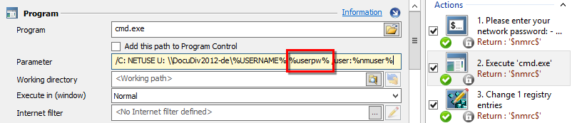 In this example, the password entered is stored in the userpw return value variable and passed to the subsequent Program action as follows: